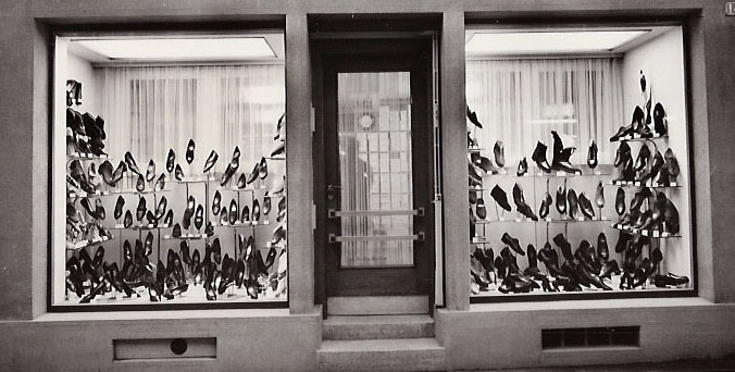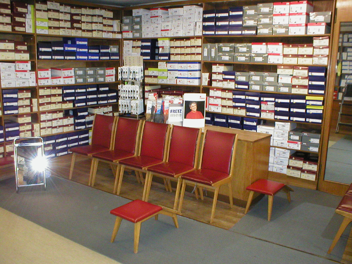 Seit über 120 Jahren: Schuhhaus Müller & Mussler Eine Ecker der Herrenverkaufsabtelung: Gern und viel gekaufte Markenschuhe bis unter die Decke gestapelt.